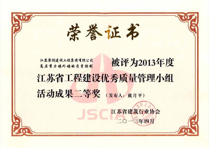 2013年度江苏省工程建设优秀质量管理小组活动成果二等奖(戴月平-高层剪力墙外墙的质量控制)